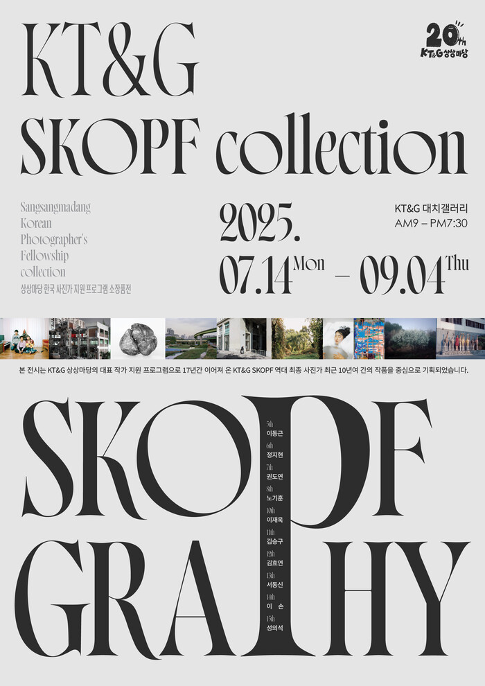 이번 전시는 ‘KT&G SKOPF 컬렉션’을 주제로 대치갤러리에서 진행되며, 서동신·이손·성의석 등 역대 최종 사진가 10인의 작품 12점을 선보인다. 관람객들은 작품전시 외에도 오프닝 이벤트로 마련된 상상마당 20주년 기념 키링 및 전시작 엽서를 만나볼 수 있다.