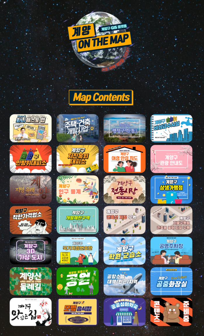 ‘계양 온 더 맵’은 ▲민선 8기 권역별 공약 지도 ▲계양의 관광 자원과 역사 ▲안전 도시 계양 ▲구민 생활에 유용한 생활정보 ▲주택·건축 개발 사업 등 27종의 주제별 지도를 담고 있다.