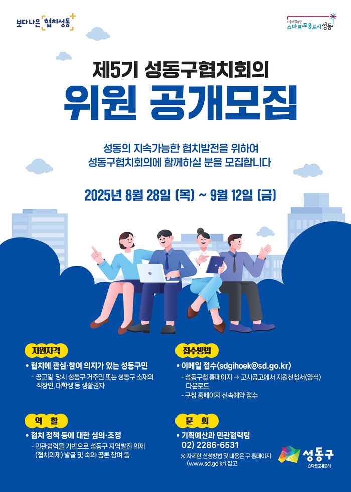 [시민일보 = 박소진 기자] 성동구(구청장 정원오)는 8월 28일부터 9월 12일까지 총 15일간 '제5기 성동구협치회의' 위원을 공개 모집한다.