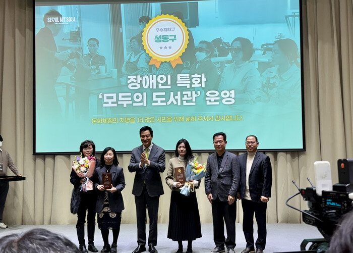 [시민일보 = 박소진 기자] 성동구(구청장 정원오) 장애인 특화 도서관 '모두의 도서관' 사업이 지난해 서울시 '약자와의 동행 지원사업' 중 우수 사업으로 선정돼 지난 10일 서울시청에서 진행된 성과보고회에서 ‘우수자치구’ 수상의 영광을 누렸다.