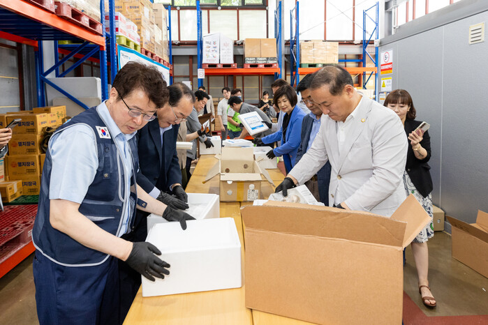 | ▲ '강서 푸드뱅크·마켓과 함께하는 삼계탕 나눔 행사'에 참석한 최동철 의장(오른쪽)과 구의회 의원들이 삼계탕을 포장하고 있다. (사진=강서구의회 제공) |