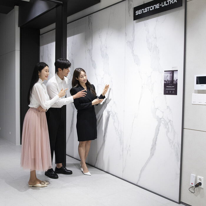 | ▲ 고객이 홈씨씨 인테리어 전시장에서 인테리어 스톤 제품인 센스톤 시리즈를 살펴보고 있다. (사진=KCC 제공) |