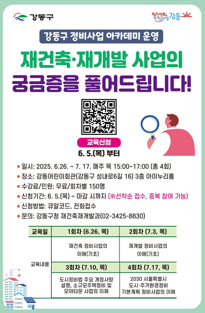 아카데미는 정비사업에 관심 있는 주민이라면 누구나 강동구청 홈페이지나 전화를 통해 선착순으로 신청할 수 있다. 회차별 최대 정원은 150명이다.