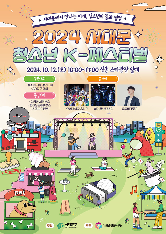 [시민일보 = 이대우 기자] 서대문구(구청장 이성헌)가 가재울청소년센터와 함께 이달 12일 오전 10시부터 오후 5시까지 신촌 스타광장 및 명물쉼터에서 청소년과 시민 누구나 즐길 수 있는 ‘청소년 K-페스티벌’을 개최한다.