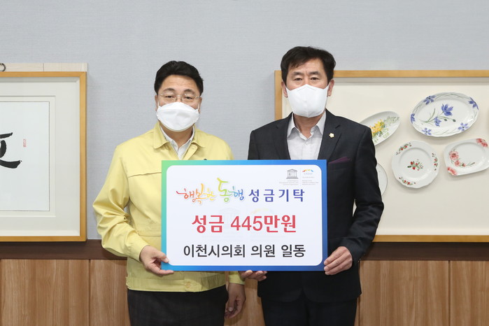 [시민일보 = 민장홍 기자] 경기 이천시의회가 최근 코로나19로 어려움을 겪는 이웃들을 위한 성금 445만원을 이천시 행복한 동행에 전달하는 기탁식을 진행했다고 25일 밝혔다.