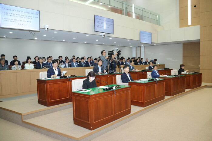 박명서 의장은 개회사를 통해 “제8대 후반기와 조직개편을 통해 새로운 진용을 갖춘 집행부가 처음 맞이하는 임시회인 만큼 시민 여러분께서도 큰 기대와 관심으로 지켜보실 것”이라며 “그동안의 의정활동을 바탕으로 제8대 후반기가 더욱 성숙하고 발전된 모습으로 나아가는 한편, 공직자 여러분께서는 합리적이고 충실한 자료 제공과 성실한 답변으로 시민의 뜻이 시정 곳곳에 반영될 수 있도록 적극 협조를 부탁드린다”고 밝혔다.