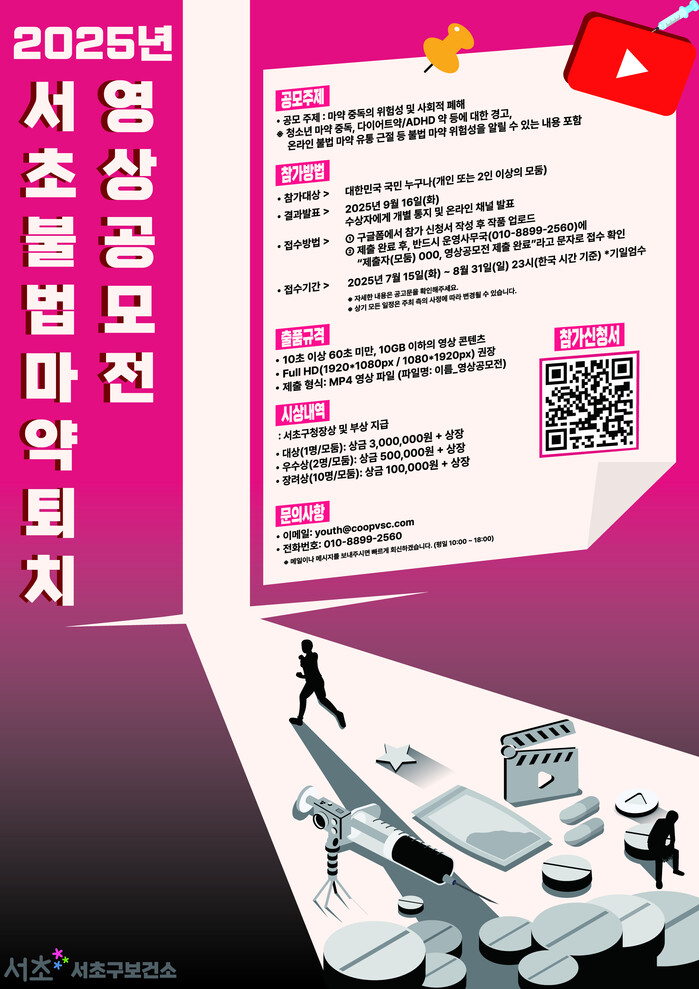 [시민일보 = 박소진 기자] 서울 서초구(구청장 전성수)는 마약 문제에 대한 경각심을 높이고, 마약범죄로부터 안전한 사회 분위기를 조성하기 위해 ‘2025 서초 불법마약 퇴치 영상 공모전’을 개최한다고 3일 밝혔다.