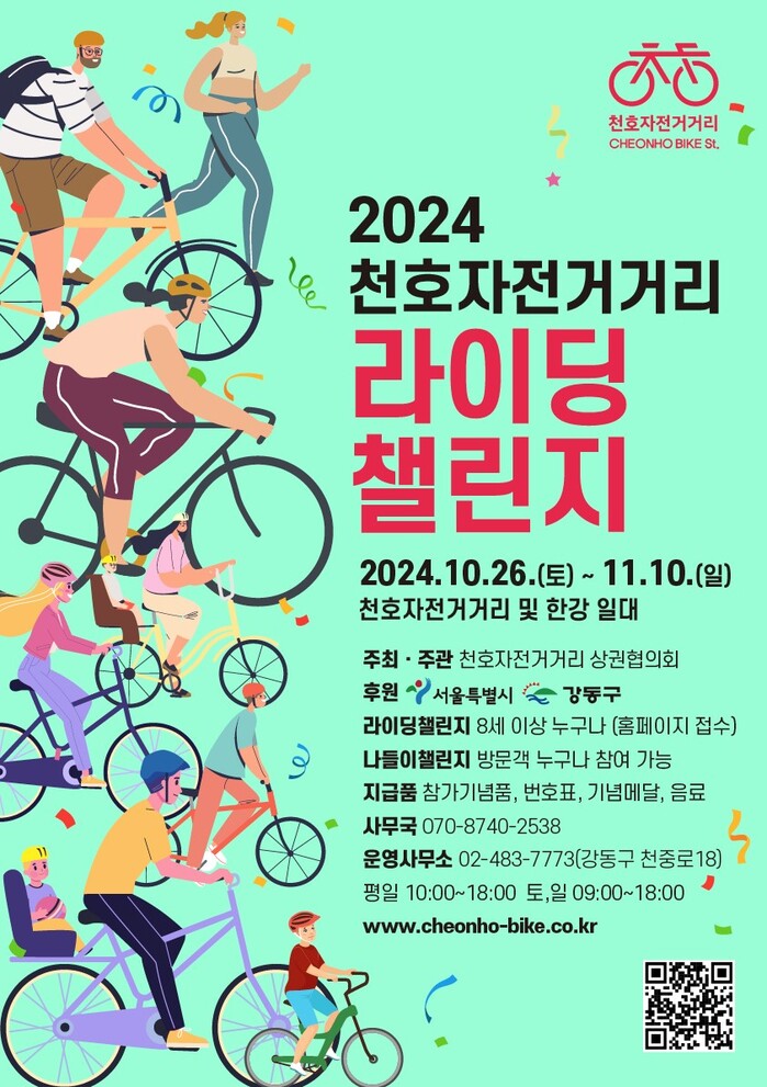 [시민일보 = 이대우 기자] 강동구(구청장 이수희)가 오는 26일부터 16일간 천호자전거거리와 한강 일대에서 ‘천호자전거거리 라이딩 챌린지’를 개최한다.