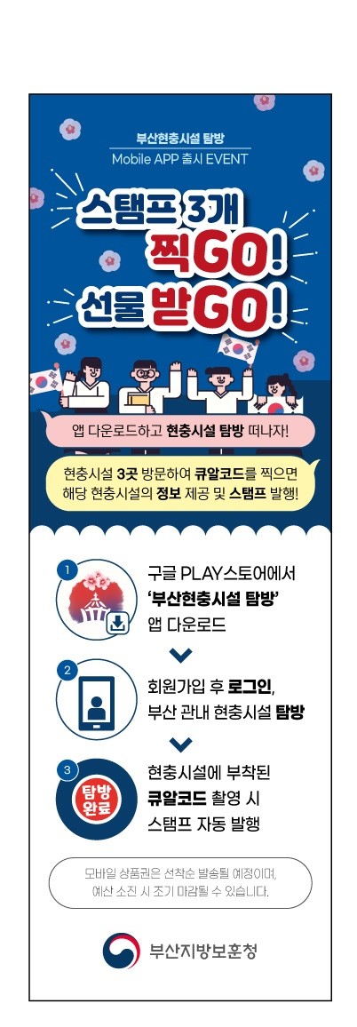 현충시설에 부착된 큐알코드를 인식하면 현충시설 1개당 1개 스탬프가 발행되고, 해당 현충시설에 대한 정보 및 VR 영상이 제공된다. 현충시설 3군데 방문하여 인증 시 모바일상품권을 제공할 예정이다.