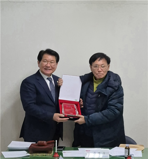 | ▲ 양평호 강동구의원(왼쪽)이 천호태영아파트 관계자로부터 감사패를 받고 있다.(사진=강동구의회 제공) |