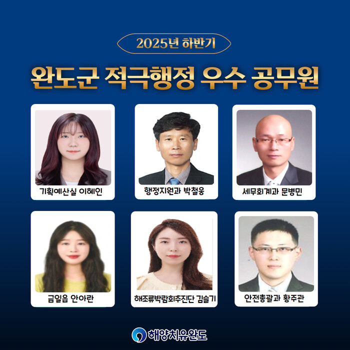 [완도=김현종 기자]완도군은 지난 24일 적극행정위원회를 개최하고 ‘2025년도 하반기 적극 행정 우수 공무원’ 4명과 협업팀 2팀을 선정했다.