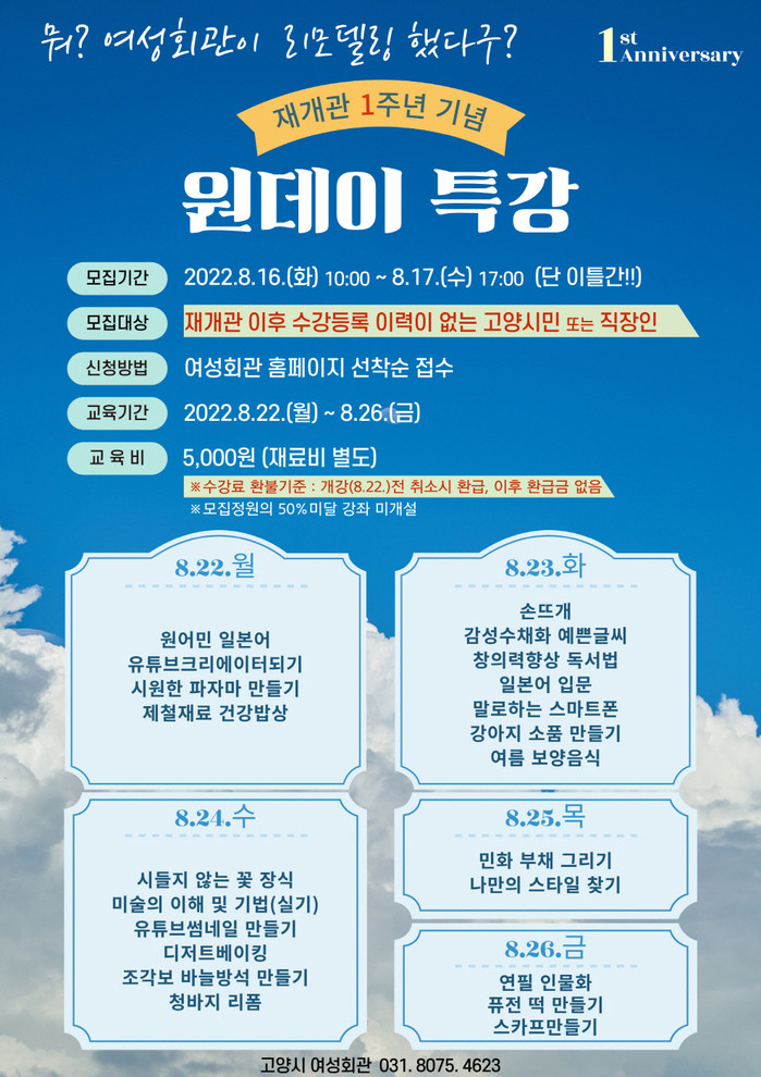 [고양=이기홍 기자] 고양시 여성회관이 재개관 1주년 기념을 기념해 원데이 특강을 운영한다.