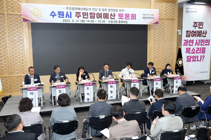 | ▲ ‘수원시 주민참여예산 토론회’에 참여한 관계자들이 토론을 하고 있다. (사진=수원시의회 제공) |