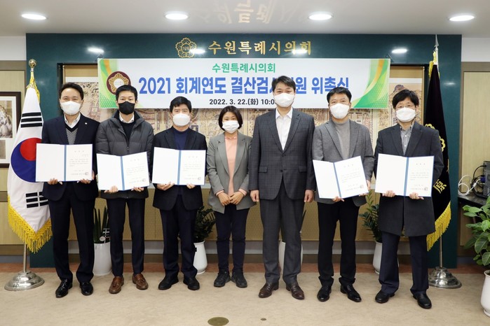 [수원=임종인 기자] 경기 수원시의회는 최근 의장실에서 2021 회계연도 결산검사 위원에 대해 위촉식을 열고, 위원들에게 위촉장을 수여했다고 밝혔다.