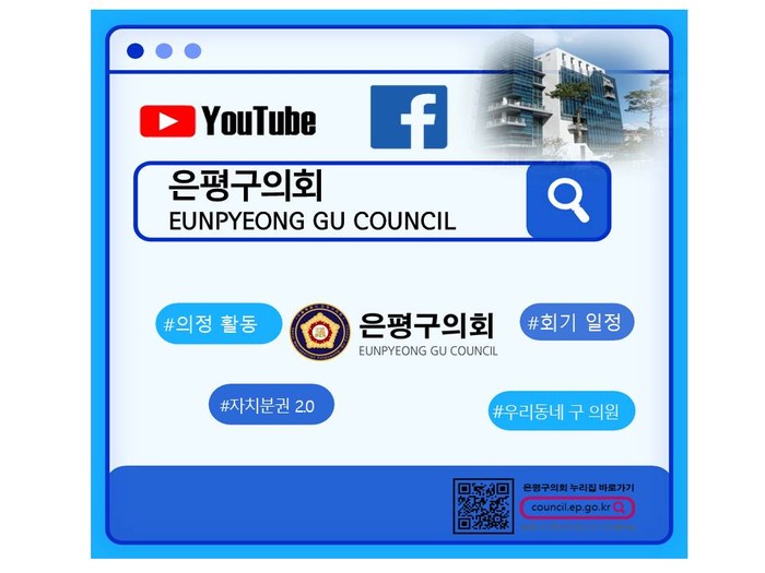 은평구의회 계정은 유튜브 공식 누리집 내 검색창에서 ‘은평구의회 EUNPYEONG GU COUNCIL’로 검색 후 구독할 수 있으며, 페이스북 공식 누리집에서 ‘은평구의회’로 검색할 수 있다.