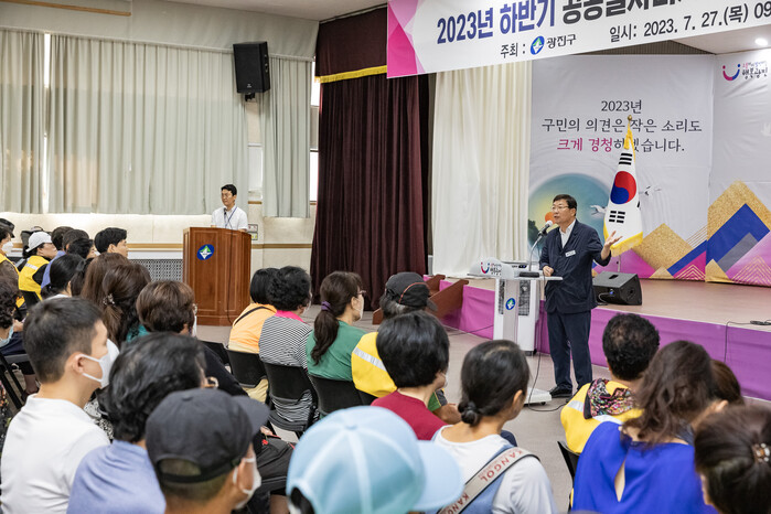 광진구가 최근 하반기 공공일자리사업 참여자를 대상으로 안전보건 및 노동교육을 실시했다. 이날 교육은 산업재해 유형과 대처 방법, 작업 주의사항 등 참여자들의 안전과 권익 보호를 위한 내용으로 진행됐다. 사진은 김경호 구청장이 하반기 공공일자리 참여자에게 인사말을 하고 있는 모습. (사진=광진구청 제공)