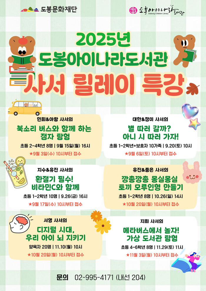 [시민일보 = 문민호 기자] 도봉구(구청장 오언석) 도봉아이나라도서관이 ‘사서 릴레이 특강’을 운영한다.