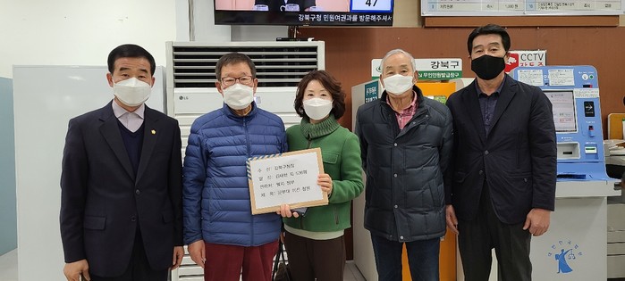 [시민일보 = 홍덕표 기자] 서울 강북구의회(의장 이용균) 조윤섭 의원(수유1동, 우이동, 인수동)은 최근 주민들과 함께 강북구청에 방문해 우이동 솔밭공원 뒤 군부대 이전과 관련된 주민청원을 제출했다.