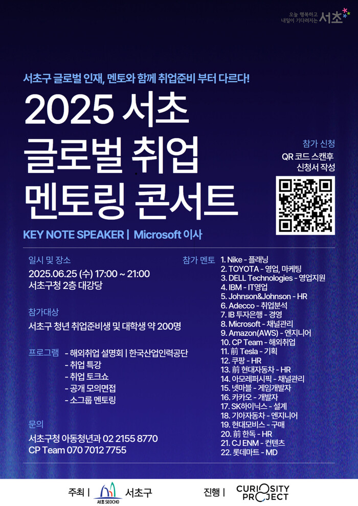 ‘2025년 서초 글로벌 취업 멘토링 콘서트’는 글로벌기업 취업을 희망하는 19세부터 39세까지의 구 거주 또는 활동 청년이라면 누구나 참여할 수 있으며, 참가 신청은 구청 홈페이지에서 구글폼을 통해 접수하면 된다.
