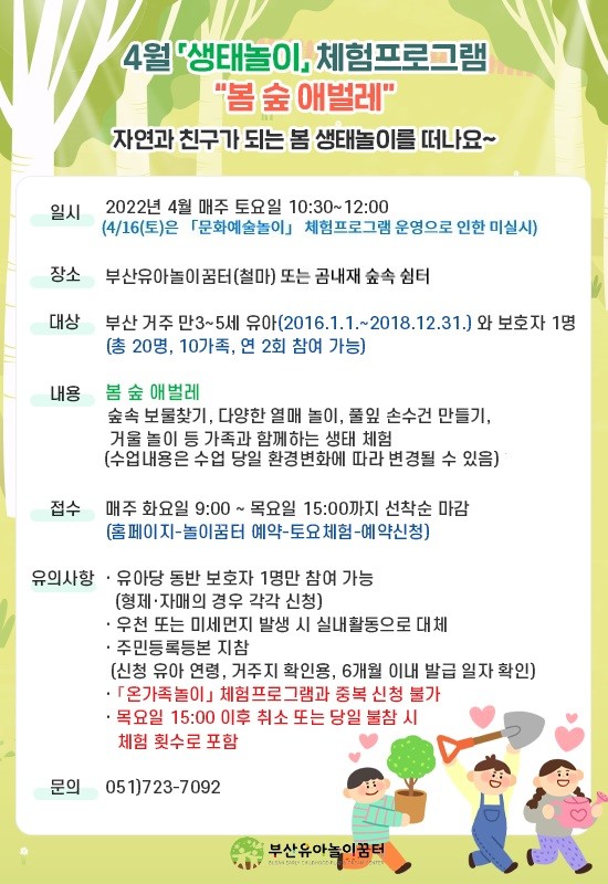 이 프로그램은 전문생태강사와 함께 부산유아놀이꿈터와 곰내재 숲속 쉼터 등 철마지역의 사계절 자연환경을 활용해 진행한다.