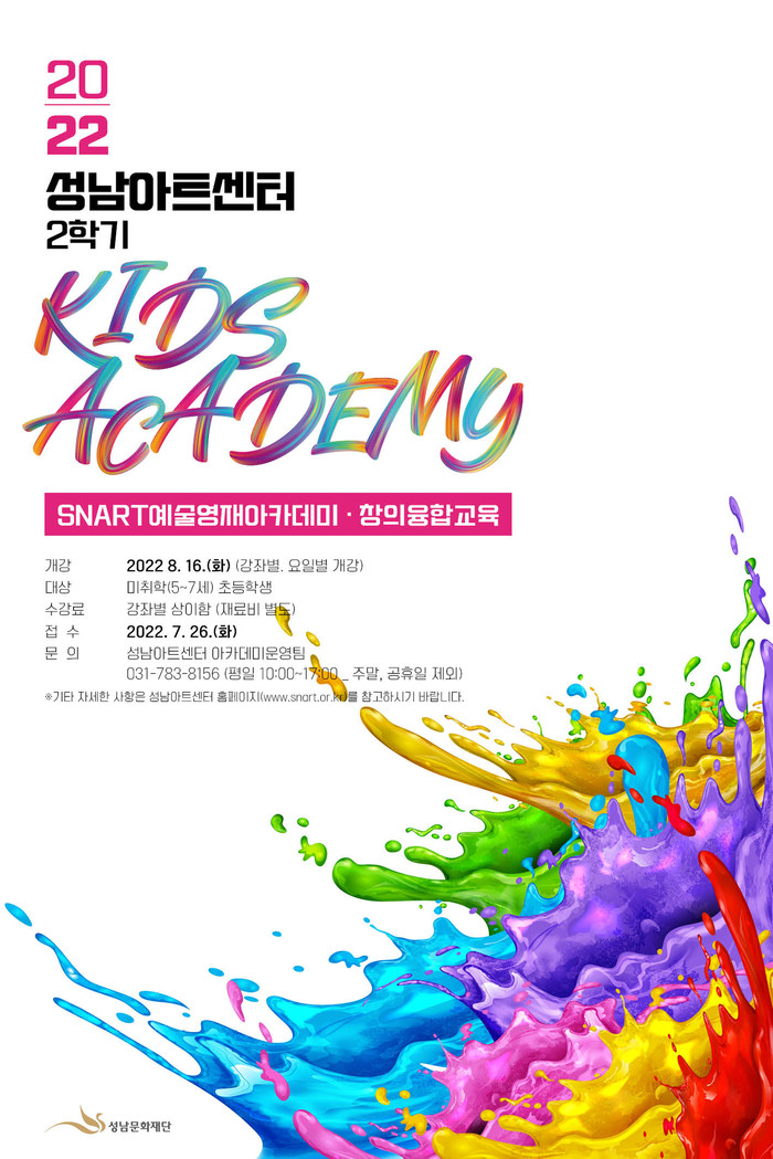 먼저 성남아트센터 아카데미는 SNART예술영재아카데미와 창의융합교육 두 분야의 어린이 정규강좌를 8월 16일(화)부터 시작한다. 예술영재아카데미 음악 강좌는 성남시립예술단과 성남아트센터 기획공연 등과 연계해 진행하고, 미술과 코딩 강좌 역시 창의적인 사고력을 바탕으로 한 다양한 창작활동으로 예술가적 자질을 키움과 동시에 다채로운 문화예술을 경험할 수 있다.