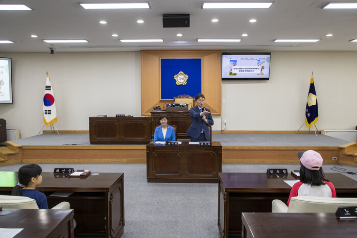 이날 견학 방문에는 최치효 의장, 최미경 운영위원장이 함께했으며, 학생들은 의회 3층 본회의장에서 구의회의 운영과 역할에 대해 배우고, 학생들이 사전에 준비해 온 궁금한 점들에 대해 적극적인 자세로 의원들과 질의 응답하는 시간을 보냈다.