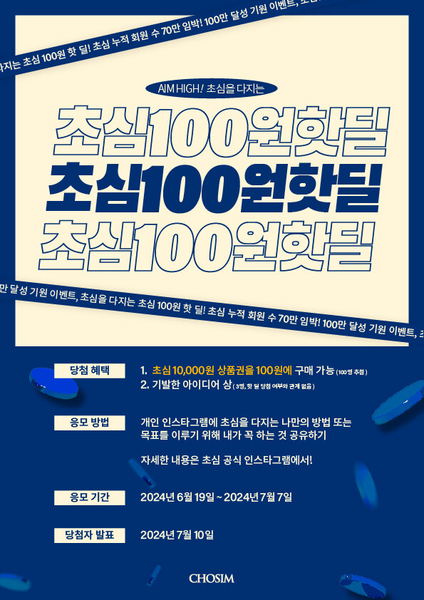 초심 스터디카페가 6월 19일부터 7월 7일까지 14일간 ‘초심을 다지는 초심 100원 핫딜’(이하 100원 핫딜) 이벤트를 진행한다고 밝혔다.