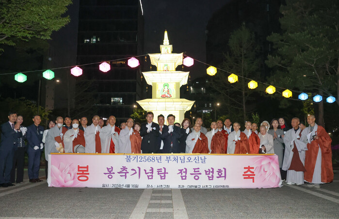 [시민일보 = 이대우 기자] 서울 서초구(구청장 전성수)가 불기 2568년 부처님 오신 날(5월 15일)을 맞아 지난 16일 구청 광장에서 봉축탑 점등법회를 개최했다.