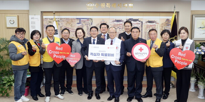 [수원=임종인 기자] 경기 수원시의회가 최근 의장실에서 열린 2024년 적십자 특별회비 전달식에서 대한적십자사 경기도지사에 100만원을 전달했다.