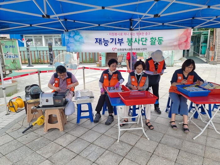 [인천=문찬식 기자] 인천 중구자원봉사센터는 지난 5일 도원동 70계단 광장에서 칼매니저(칼갈이) 활동을 진행했다고 밝혔다.