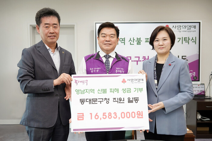 [시민일보 = 이대우 기자] 동대문구(구청장 이필형)는 영남권 산불 피해 주민들을 돕기 위해 직원들이 모금한 성금 1658만3000원을 사회복지공동모금회 서울특별시지회에 기탁했다고 11일 밝혔다.