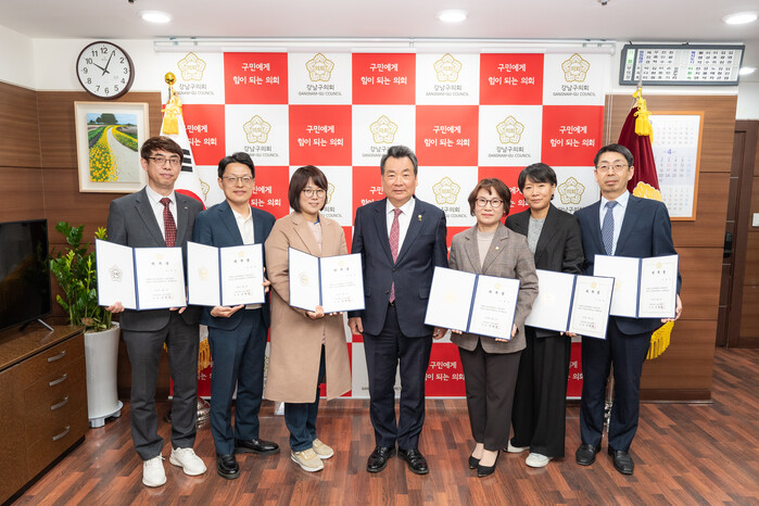| ▲ 김형대 의장(가운데)과 결산검사 위원들이 기념촬영을 하고 있다.(사진=강남구의회 제공) |