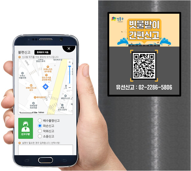 구는 지난해 8월 QR코드를 활용한 ‘원클릭(One-Click) 빗물받이 신고시스템’을 도입했다. 별도의 예산 투입 없이 성동구가 자체 개발한 것으로 스마트폰을 통해 누구나 어디에서든 빗물받이 청소, 악취, 파손 등 다양한 문제를 쉽게 신고하고 빠르게 대응할 수 있다.