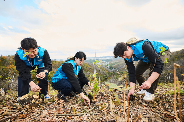 | ▲ KT&G가 울진 산불 피해로 훼손된 산림을 복구하기 위해 울진군 북면 해안생태 탐방로 인근에 ‘상상의 숲’을 조성한다. 사진은 지난 7일, KT&G 임직원 봉사단이 나무를 식재하고 있는 모습. (사진=KT&G 제공) |