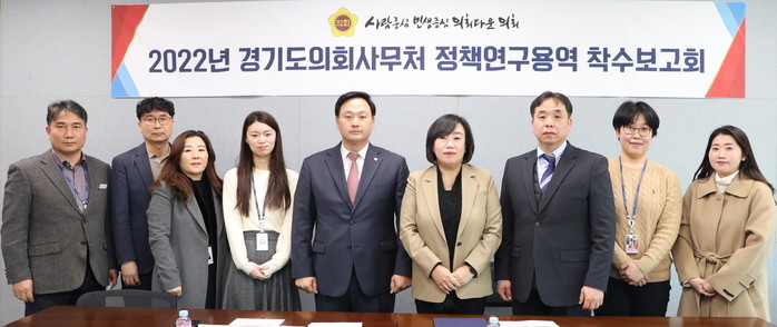 | ▲ 최근 열린 2022년 경기도의회사무처 정책 연구용역 착수보고회에서 관계자들이 기념촬영을 하는 모습. (사진제공=경기도의회) |