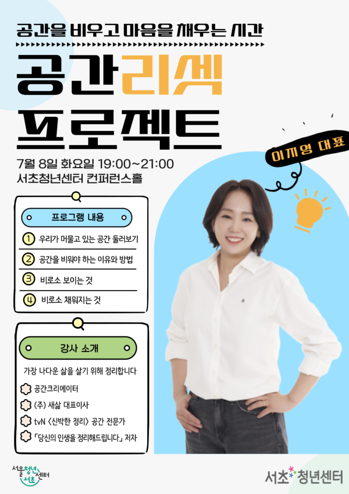 첫 강연은 오는 8일 오후 7시, tvN ‘신박한 정리’로 잘 알려진 이지영 ㈜새삶 대표가 진행하는 ‘공간 리셋 프로젝트’로 시작된다. 청년들이 스스로의 공간을 가꿀 수 있도록 돕고, 단순한 정리를 넘어 마음을 정돈하는 공간 관리법을 제시한다.