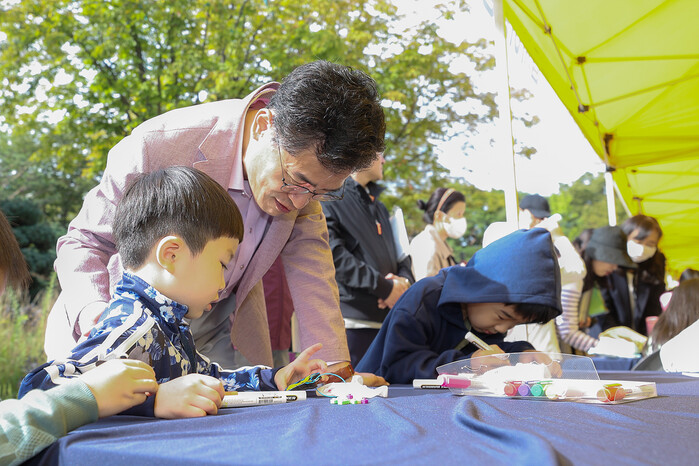 | ▲ 지난해 10월 해우리 나눔장터에서 지역 아동과 소통중인 이기재 양천구청장 (사진=양천구청 제공) |