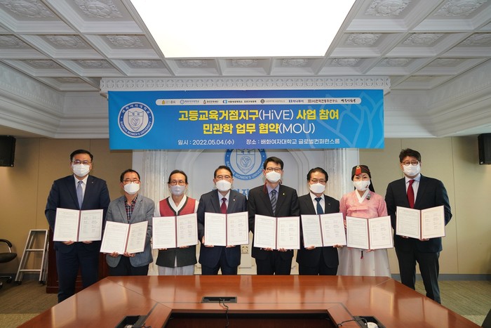 서울 종로구가 최근 교육부 고등직업교육거점지구(HiVE) 공모사업 참여를 위해 배화여대 등과 산·학·관 거버넌스 협약을 체결했다. 협약식에서 8개 기관은 종로만이 보유한 풍부한 역사문화자산이 지역 일자리 창출로 이어질 수 있도록 상호 협력할 것을 약속했다. 사진은 협약식에서 관계자들이 기념촬영을 하고 있는 모습. (사진제공=종로구청)