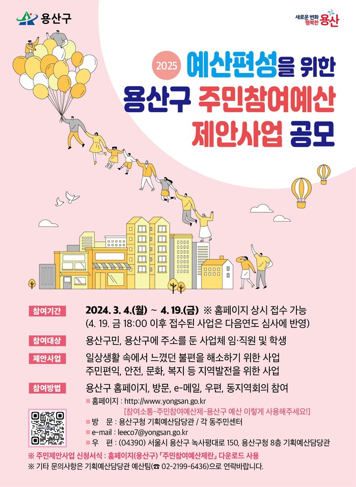 [시민일보 = 여영준 기자] 용산구(구청장 박희영)는 오는 4월19일까지 2025년도 예산에 편성할 주민참여예산 사업을 신청받는다고 밝혔다.