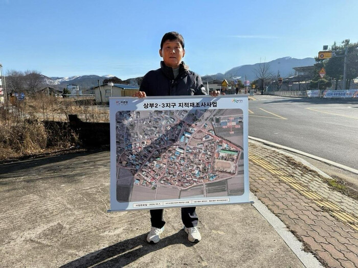 「지적재조사 마을도면」이란 지적재조사사업을 통해 새로 확정된 토지 경계를 드론으로 촬영한 최신 항공영상과 중첩하여 일대의 경계를 한 눈에 볼 수 있게 만든 족자형 도면이다. 군은 지적재조사 마을도면을 통해 주민들이 지적재조사사업의 효과를 일상생활에서 체감하고, 인근 지적불부합지역에 대한 지적재조사사업의 확산을 기대하고 있다.
