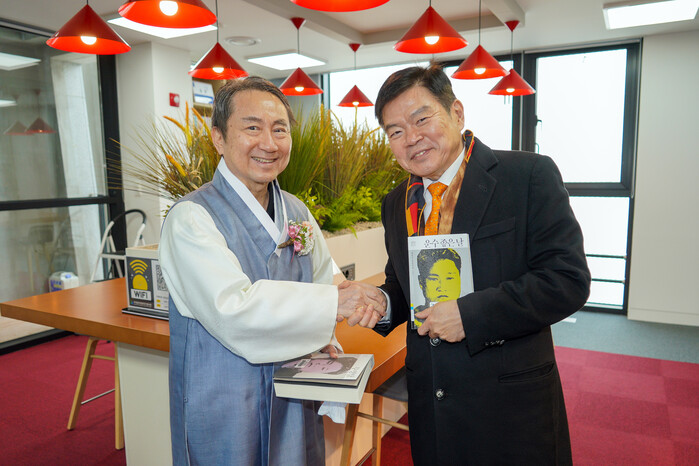 | ▲ 현진건 기념 도서관 및 경로당 개관식 참석한 현진건 외손자 박동건 고려대 심리학과 교수와 기념촬영하는 이필형 구청장(사진 오른쪽).(사진=동대문구청 제공) |