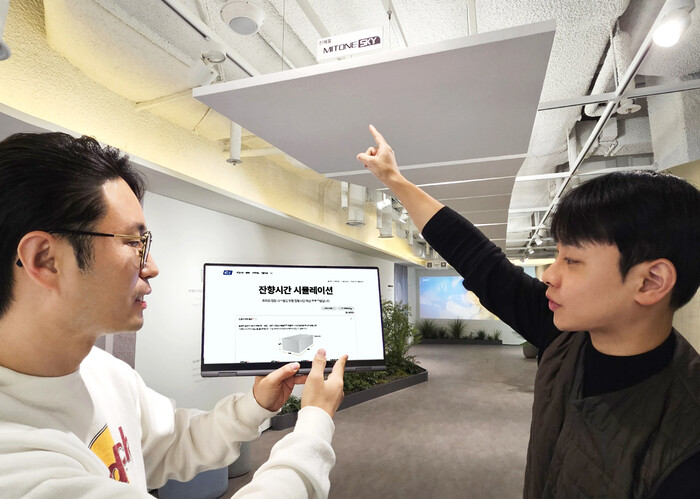 | ▲ KCC 직원들이 마이톤스카이가 설치된 서초사옥 더 클렌체 갤러리에서 잔향시간 시뮬레이션에 대해 의견을 나누고 있다. (사진=KCC 제공) |