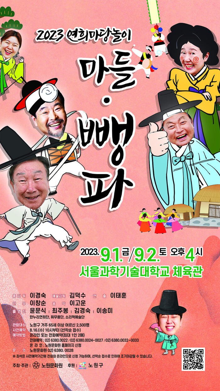 [시민일보 = 홍덕표 기자] 노원구(구청장 오승록)가 오는 9월1·2일 오후 4시 서울과학기술대학교 체육관에서 지역내 노인을 위해 준비한 연희마당놀이 '마들·뺑파'를 선보인다.