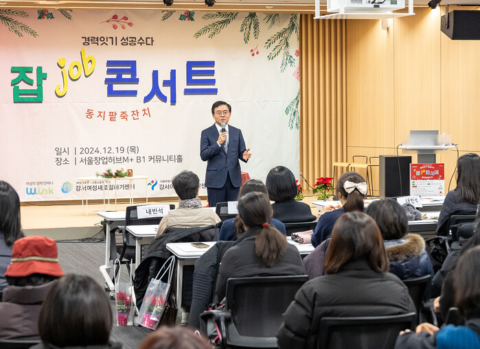 [시민일보 = 박소진 기자] 진교훈 서울 강서구청장이 지난 19일 마곡동 서울창업허브M+에서 열린 ‘경력잇기 성공수다 잡(JOB) 콘서트’를 찾아 경력보유 여성들을 격려했다.