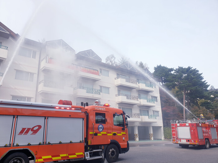 | ▲ 무주덕유산리조트 가족호텔 진달래동에서 소방훈련 하는 모습. (사진=부영그룹 제공) |