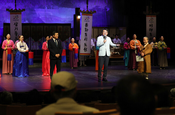 | ▲ 오승록 노원구청장이 지난 5일 오후 서울 노원구 노원문화예술회관 대공연장에서 열린 연희마당놀이 ‘맹진사댁 경사’ 공연에 참석해 인사말을 하고 있다. 사진 왼쪽부터 손영준 노원구의장, 오 구청장, 김덕수 사물놀이 명인. (사진=노원구청 제공) |