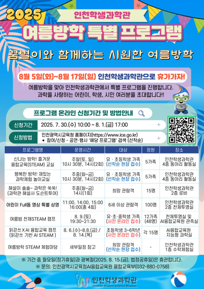 [인천=문찬식 기자] 인천광역시교육청AI융합교육원(원장 심현보)은 여름방학을 맞아 8월 5일부터 17일까지 인천학생과학관에서 특별 프로그램 ‘꿈별이와 함께하는 시원한 여름방학’을 운영한다.