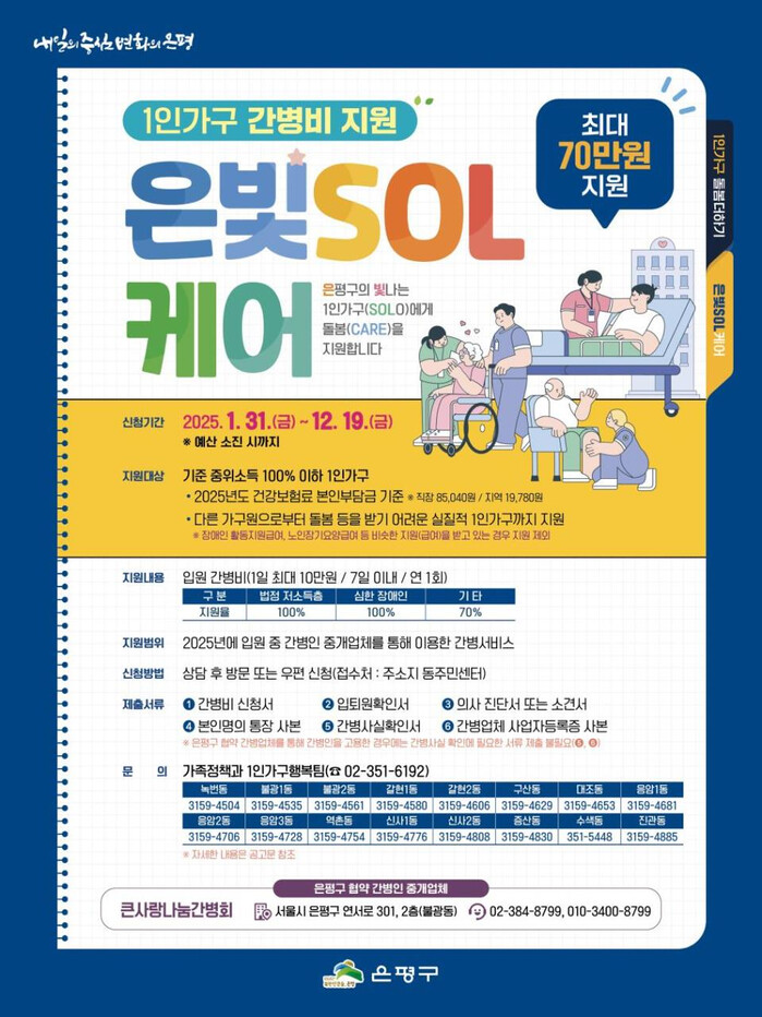 [시민일보 = 이대우 기자] 은평구(구청장 김미경)는 입원으로 돌봄이 필요한 1인가구에 최대 70만 원의 간병비를 지원하는 ‘은빛SOL케어’ 사업을 시행한다고 밝혔다.