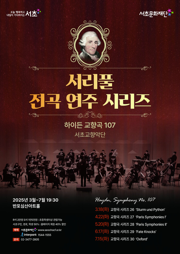 [시민일보 = 박소진 기자] 서초문화재단과 서초교향악단이 함께하는 ‘서리풀 전곡 연주 시리즈’ 하이든 교향곡 107 전곡 시리즈가 이달부터 7월까지 총 5회에 걸쳐 진행된다.