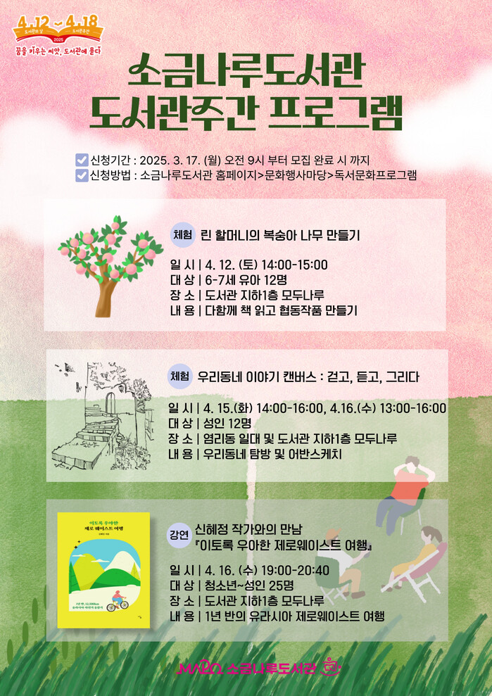 [시민일보 = 문민호 기자] 마포구(구청장 박강수) 소금나루도서관은 도서관 주간을 맞아 오는 4월12일부터 16일까지 다양한 프로그램을 운영한다.